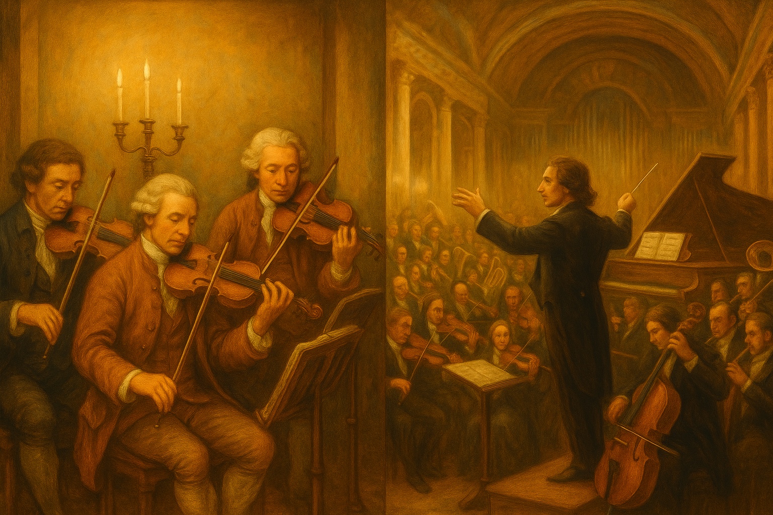 고전시대는 균형·비례·명료성과 논리적 형식을, 낭만시대는 주관성과 감정·상상력을 중시했다. 그러나 두 시대는 공통으로 장조·단조의 조성음악을 공유했고, 소나타·교향곡 같은 형식을 이어받아 각기 다른 미학을 펼쳤다. 본문은 차이점과 공통점을 함께 정리한다.