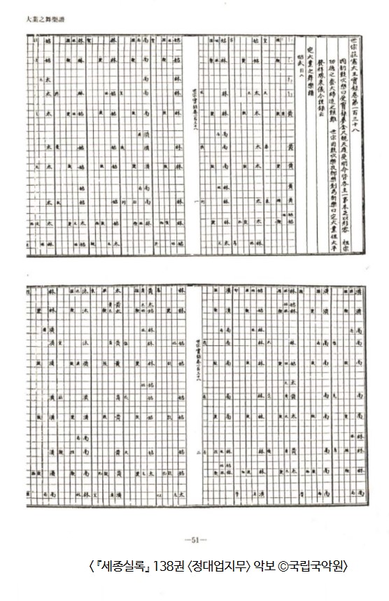 - 사료: 《세종실록》 대성악보, 《세조실록》 신제아악보.