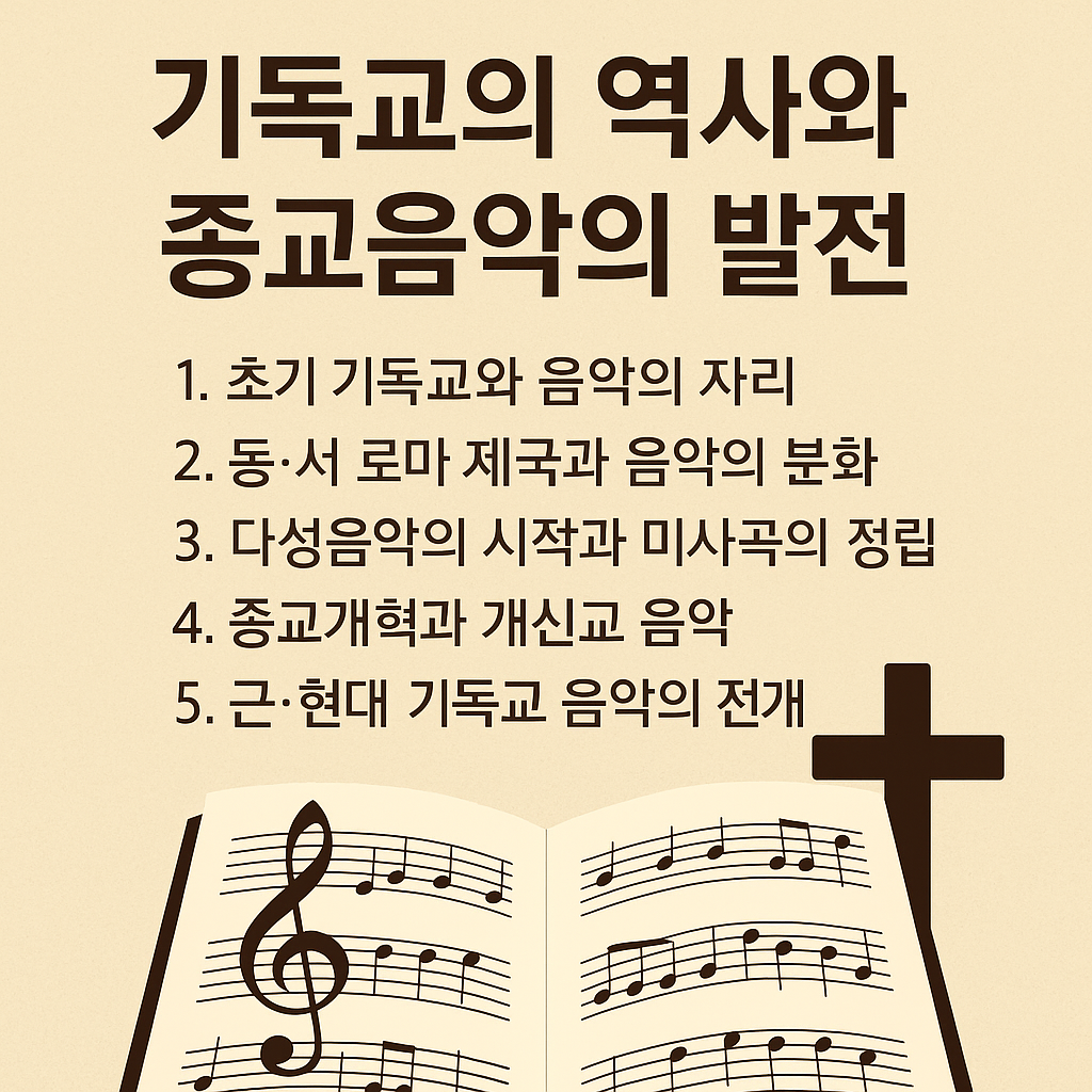 기독교의 역사는 곧 종교음악의 역사라 할 수 있다. 교회와 사회의 변화 속에서 음악은 신앙을 표현하고 예배를 형성하며 예술의 새로운 길을 열었다. 초기 성가에서 현대 CCM에 이르기까지 종교음악은 단순한 예배 도구를 넘어 인류 문화유산으로 자리 잡았고, 앞으로도 시대와 함께 변모하며 울려 퍼질 것이다.