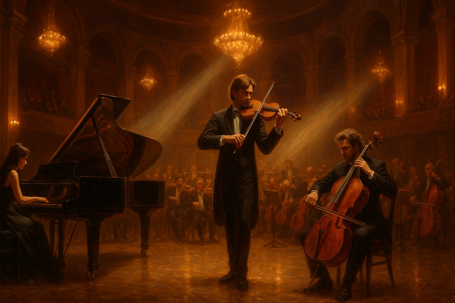 멘델스존 e단조는 독주가 먼저 말문을 여는 새 문법을 선보인다. 1악장 중간의 연결형 카덴차는 곡의 흐름을 끊지 않고 구조를 접착한다. 브루흐 g단조는 풍성한 선율과 민속 리듬이 결합한 낭만의 얼굴이며, ‘스코틀랜드 환상곡’으로 서정의 세계를 확장한다. 브람스 D장조는 교향적 스케일과 관현악의 대등성을 견지하며, 요아힘 계열 카덴차 전통이 사유하는 비르투오시티의 전형이 된다. 차이콥스키 D장조는 광활한 선율, 진폭 큰 다이내믹, 춤 리듬의 추진력으로 청중을 몰아친다. 여기에 비에니아프스키 1·2번은 대담한 기교와 폴란드적 정서를, 랄로 〈스페인 교향곡〉은 협주곡적 성격의 파노라마를 제시한다.