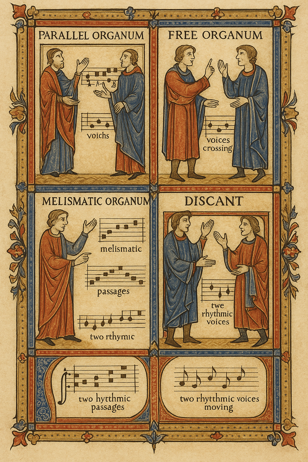 병행 오르가눔(9세기) — 주성부 아래에 오르가눔 성부를 4·5·8도 간격으로 병행시키는 방식이다. 이때 오르가눔 성부는 독립 선율이 아니라 주성부를 따라다니는 보조 성부에 머물렀고, 성가의 울림을 두텁게 만드는 효과를 냈다.