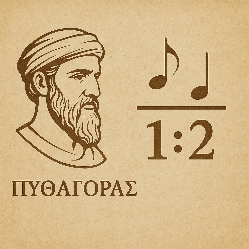 피타고라스는 소리의 높낮이를 수학적 비율로 설명할 수 있다고 보았다. 줄의 길이를 반으로 줄이면 주파수가 두 배가 되어 한 옥타브(1:2)가 된다. 줄의 길이를 2:3 비율로 조정하면 완전5도, 3:4로 조정하면 완전4도가 만들어진다. 이 세 비율은 단순하면서도 조화로운 음정으로, 고대부터 “가장 안정적인 간격”으로 여겨졌고, 실제로 공명과 배음 관계에서도 비교적 간단한 정수비로 나타난다. 이러한 관점은 소리를 감각이 아닌 측정 가능한 질서로 바라보게 만들었고, 음악을 수학·철학과 연결하는 전통을 만들었다.